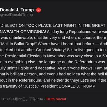 特朗普今天(北京时间4月23日)发文写道:“昨晚在伟大的弗吉尼亚联邦发生了一场被操纵的选举!整整一天共和党人都在赢,那种气势无与伦比,直到最后关头,当然了,突然冒出一大堆‘邮寄选票’!这种事我在哪儿听说过?民主党人又靠这些肮脏手段赢了!明明六比五的局面变成了十比一,然而11月的总统大选几乎是五五开。除此之外,公投上的措辞是故意搞得晦涩难懂、充满欺骗性的。众所周知,我是一个极其聪明的人,就连我都搞不清楚他们在公投里说的是什么鬼东西,他们自己也不知道!让我们看看法院能不能纠正这场‘司法’闹剧。”
